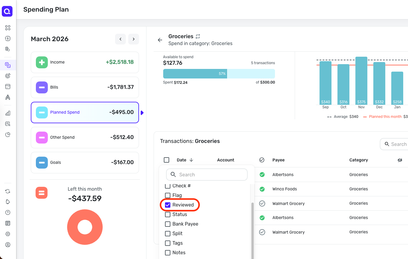 The ability to add the 'Reviewed' to the Transaction Activity areas of the Spending Plan, Reports, and Watchlists is now available.