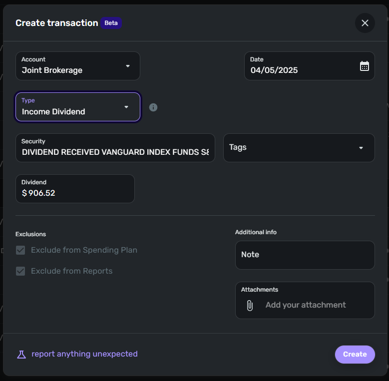 I take my brokerage dividends and use it in my spending plan so I don't reinvest them. So I have them as Payments/Deposits. If you want to reinvest them and still have them show up in Reports, you have to jump through some hoops. (I wish Simplifi would just let you change the attribute but they don't) I misspoke earlier so sorry. So what you can do is this: