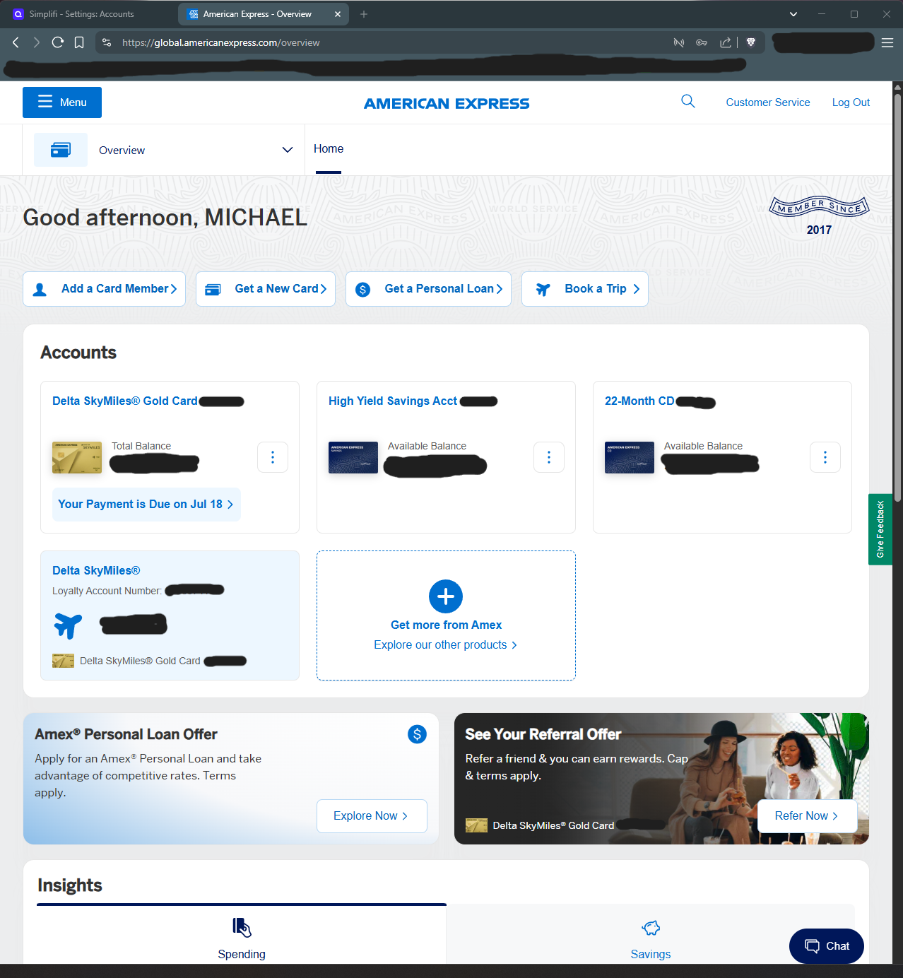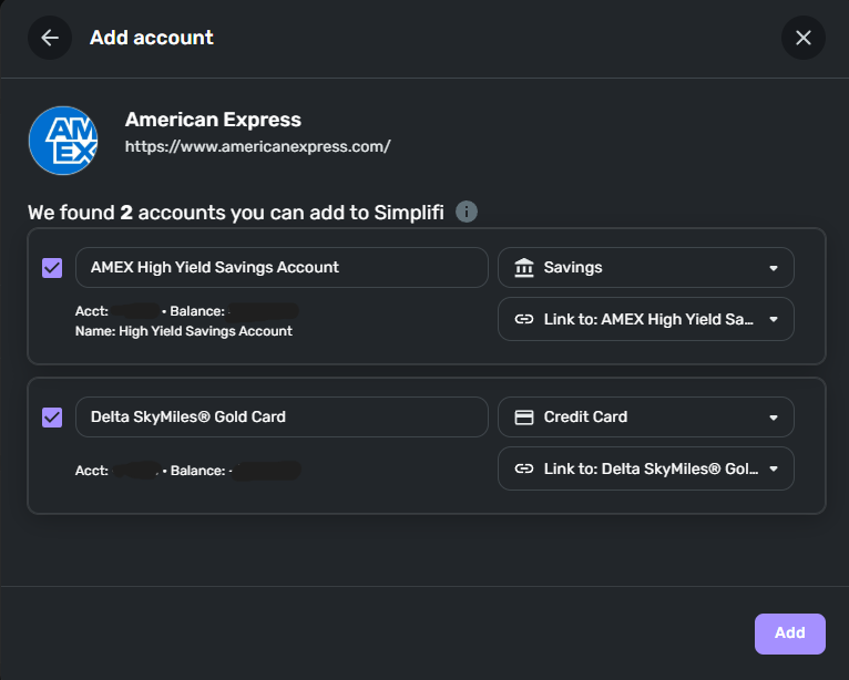 I have added my American Express account. It's been on for a while with no real issue. My Credit card shows and my recently added High Yield Savings also shows after adding it in. I also recently (over a month ago) added a CD to the account. When I add an American Express account or edit the existing, it shows in the items to add, but when I try to add it, Simplfi says all accounts already added and there is no CD showing. I have a CD with another bank and it shows under the accounts and added no problem. This seems to be a problem with AMEX specifically? Anyone else have issues with this showing? I also removed the account and re-added all 3 accounts back, still only shows the CC and HYS.