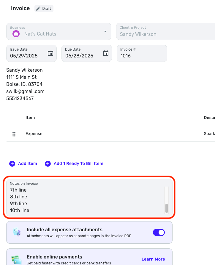 Since it appears that you can create separate lines in the Notes field, and add at least 10 lines, when filling out the Invoice details, but the separate lines don't carry over to the Invoice itself, I have edited this request accordingly.