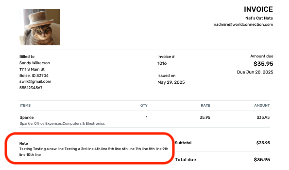 If I'm misunderstanding, please let me know, and add more clarity as to what specifically you're looking for in regards to separate lines in the Notes field on Invoices.
