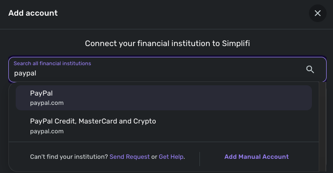 Checking and Savings accounts will use the instance listed as "PayPal" in Quicken Simplifi, while other accounts, such as Credit Cards, will use the PayPal instance in Quicken Simplifi listed as "PayPal Credit, MasterCard and Crypto".