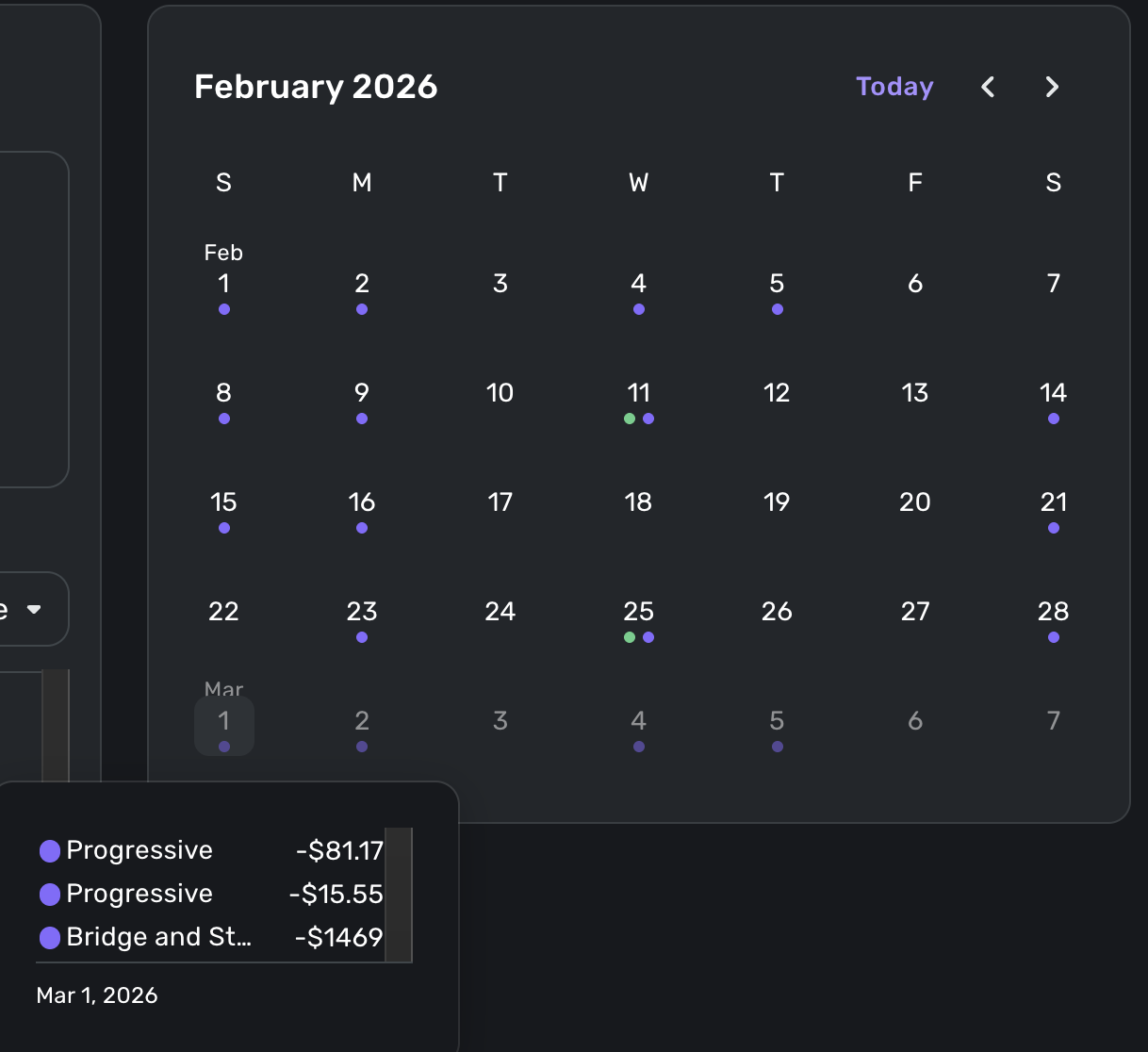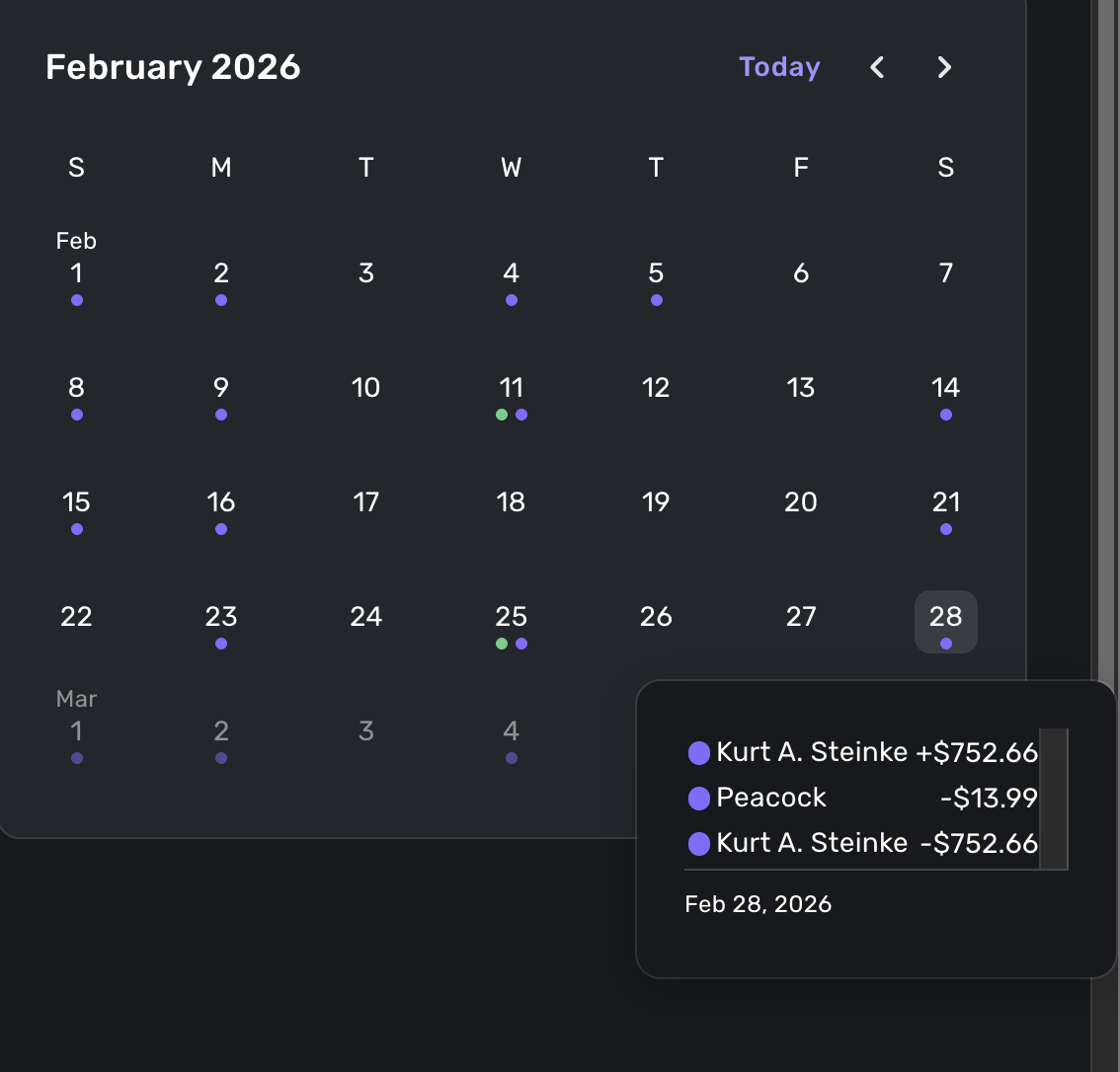 And here are two shots of the Bills & Income calendar showing the charges doesn't appear on either the 28th or the 1st: