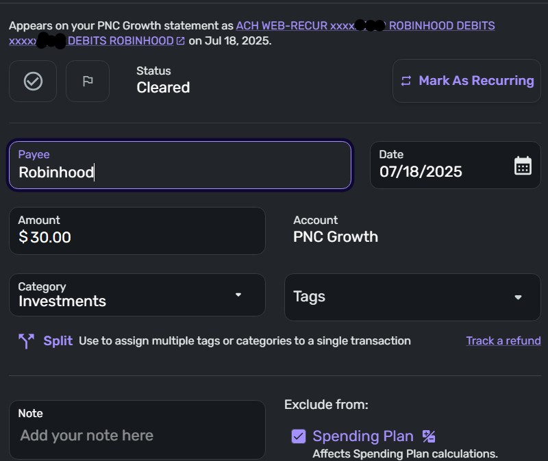 Little confused on the best way to categorize my transfer of money from my banking accounts to Robinhood. I have a lot of recurring monthly purchases of stocks, ETF's, etc that are withdrawn from my banking account for those purchases plus i'll make occasional buys one-time on certain stocks. I was categorizing as an "investments" and excluding from reports and spending plan. It seems to be more like a transfer of funds?