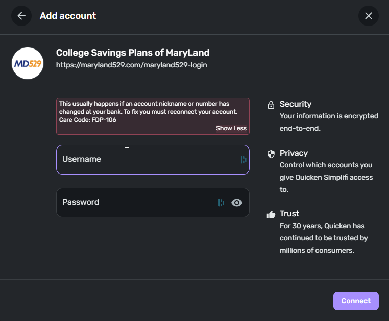 I was experiencing the same problem but I deleted my Maryland 529 accounts which I probably should not have done. In any case, I am now simply unable to link to the accounts — I get the same error FDP-106. I have not changed account numbers or names at the Maryland 529.