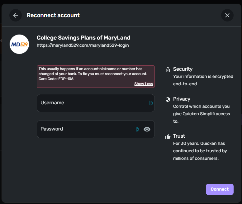 I'm trying to track my 529 but quicken's connection to it is constantly breaking. The error message says this happens because a name or number has changed, which is flatly incorrect, and would be preposterous considering the frequency of the issue. The only fix is removing and readding, and I'm getting quite tired of doing that.