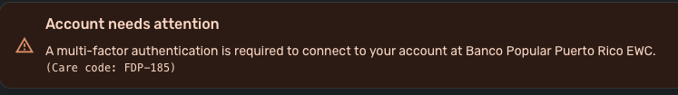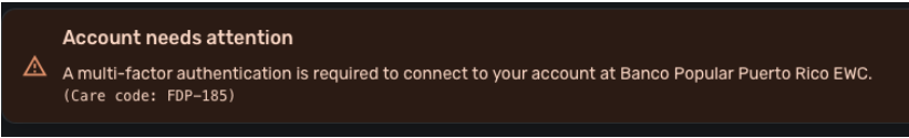 Not working for me. When I add the bank, it will ask for 2FA and pull the accounts. Then, it will ask for 2FA again and finish. However, when verifying the account, no information is populated, and it prompts me to try again. It still stays on a loop and always mentions the FDP-185 error.
