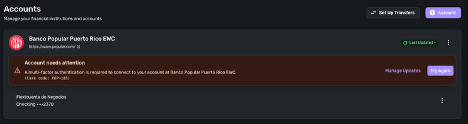 • Once you see the account(s) listed in the Manual Accounts section under Settings > Accounts, go back through the Add Account flow to reconnect to the bank.