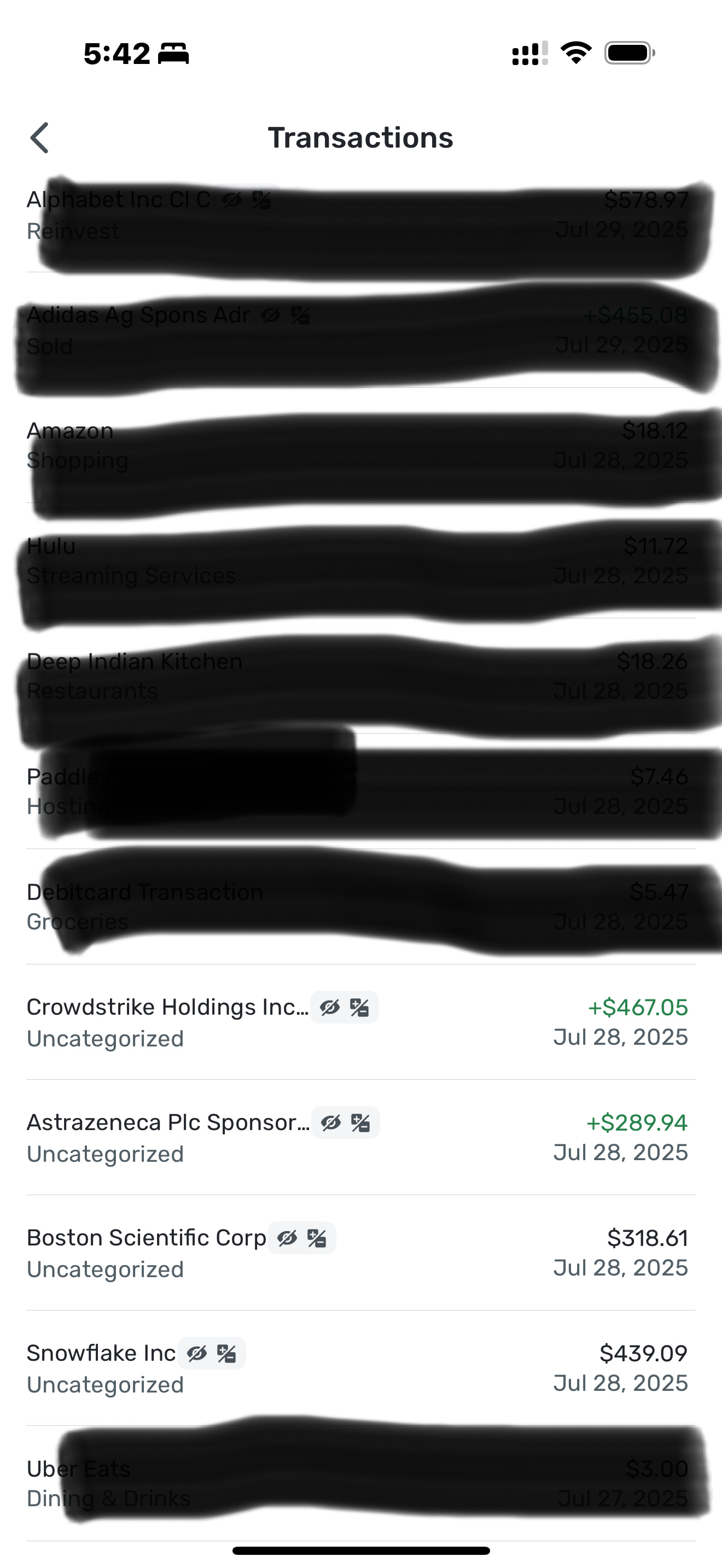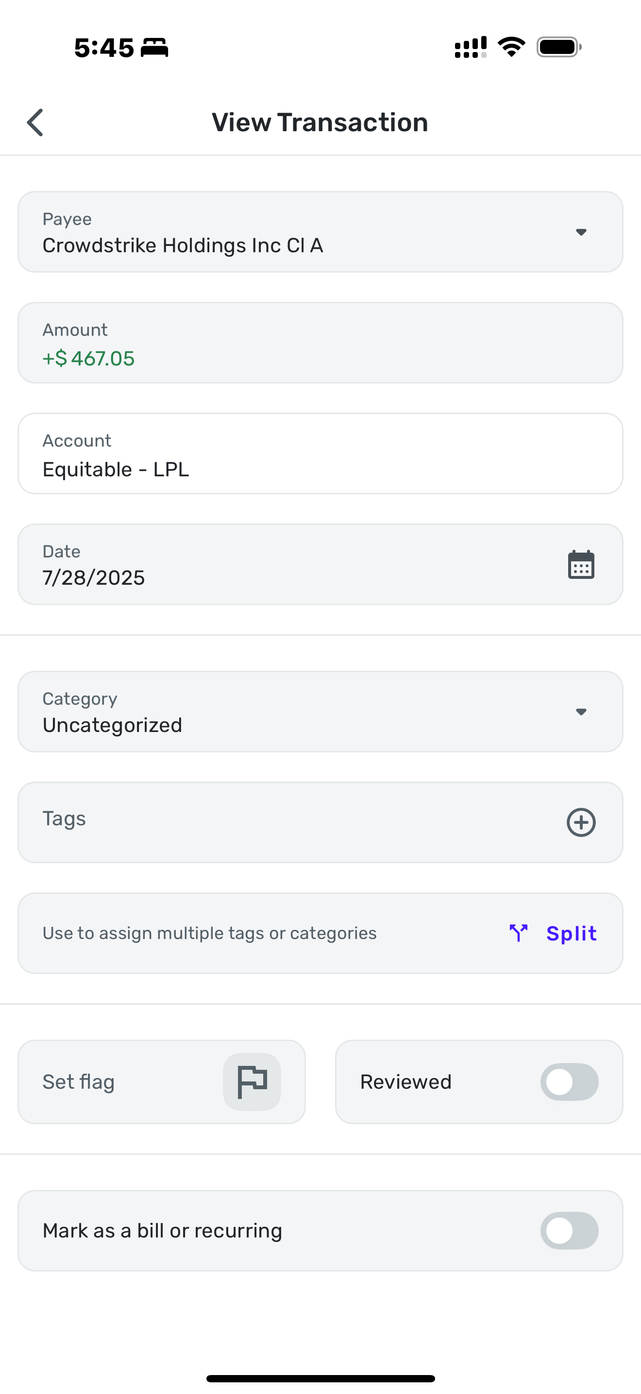 - In the list of transaction pick an investment transaction which uncategorised or for that matter pick any buy/sell transaction. I am selecting a Crowdstrike sell transaction for 467.05 on July 28th.