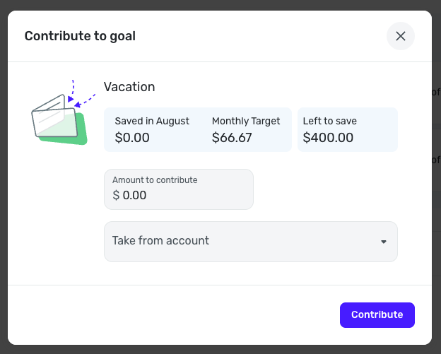 Then I go to the spending plan I can see I have not contributed to the goal for this month. (which is what I expect) So I click on the goal to contribute the monthly amount I have chosen. At this point I would expect the amount of money in the savings goal to be the starting amount I created it with plus the contribution I just did for this month.