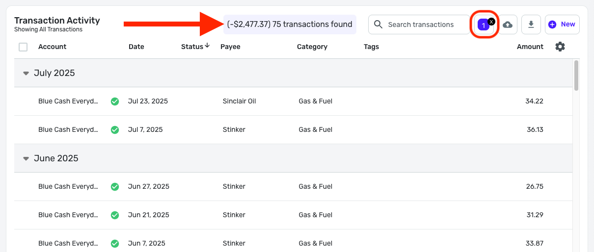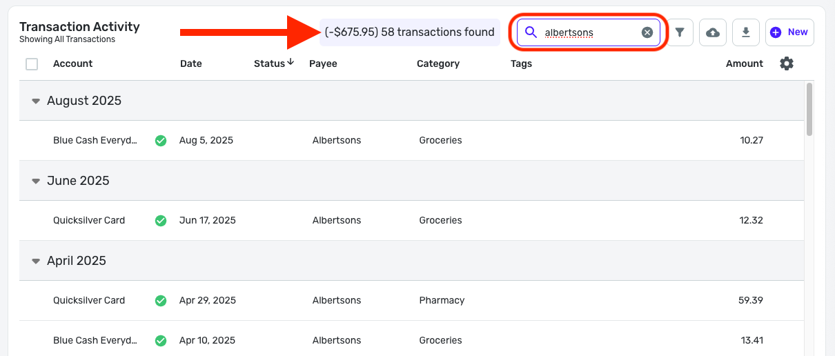 Feature request: Please add the total number of transactions and the total dollar amount of the filtered or searched results to the top summary line in the Transactions view.