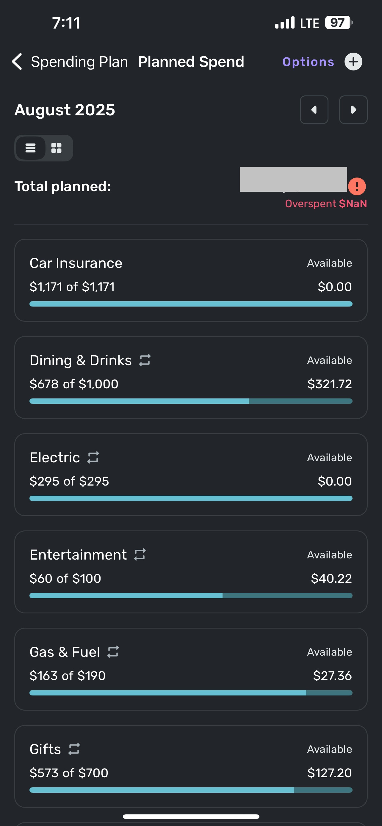 Thanks for the screenshot. Do you just see this issue from Planned Spending, or do you also see it in the 'Left at end of month' section of the Spending Plan? Are you able to open the web application from a computer to see if the issue is also affecting you there? Have you also tried uninstalling/reinstalling the mobile application to see if that fixes the issue you are seeing?