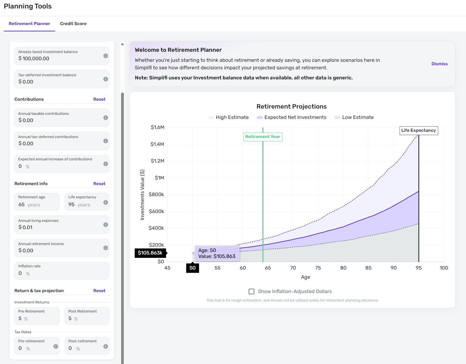Since the Retirement Planner is intended to be an exploratory tool only, there is limited information available on how the numbers are calculated. When attempting to replicate any issues using the numbers shown in your screenshot, I'm not sure that I'm understanding the issue. When I enter $100,000 in the 'Already taxed investment balance' field in the Advanced tab, the rest of the fields retain numbers. Did you manually enter the data in the rest of the fields, or are you saying that Quicken Simplifi entered zeros automatically? Have you tried resetting the form to the default and re-entering your data?