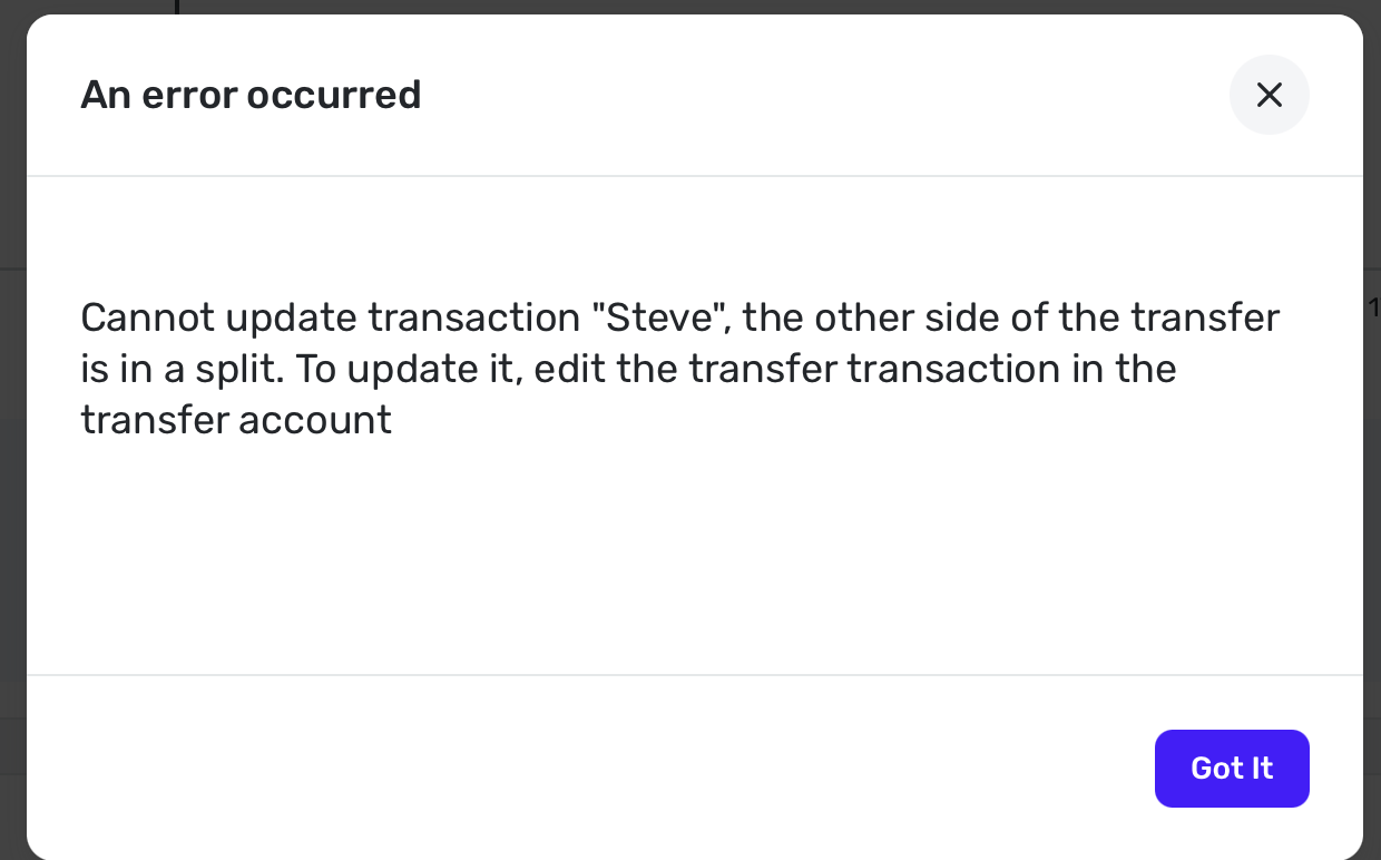 Hi, when I create a "pending" transaction that has split categories and one or more of those categories is a transfer to another account, and I subsequently mark the transaction as "cleared", the corresponding transfer transaction(s) remains marked as "pending". This is fine and probably how it should work. However when I attempt to mark the transfer transaction(s) as "cleared" I get an error stating that "Cannot update transaction, the other side of the transfer is in a split. To update it, edit the transfer transaction in the transfer account". There doesn't appear to be any way around this other than to delete and then recreate the transfer as a "cleared" transaction.