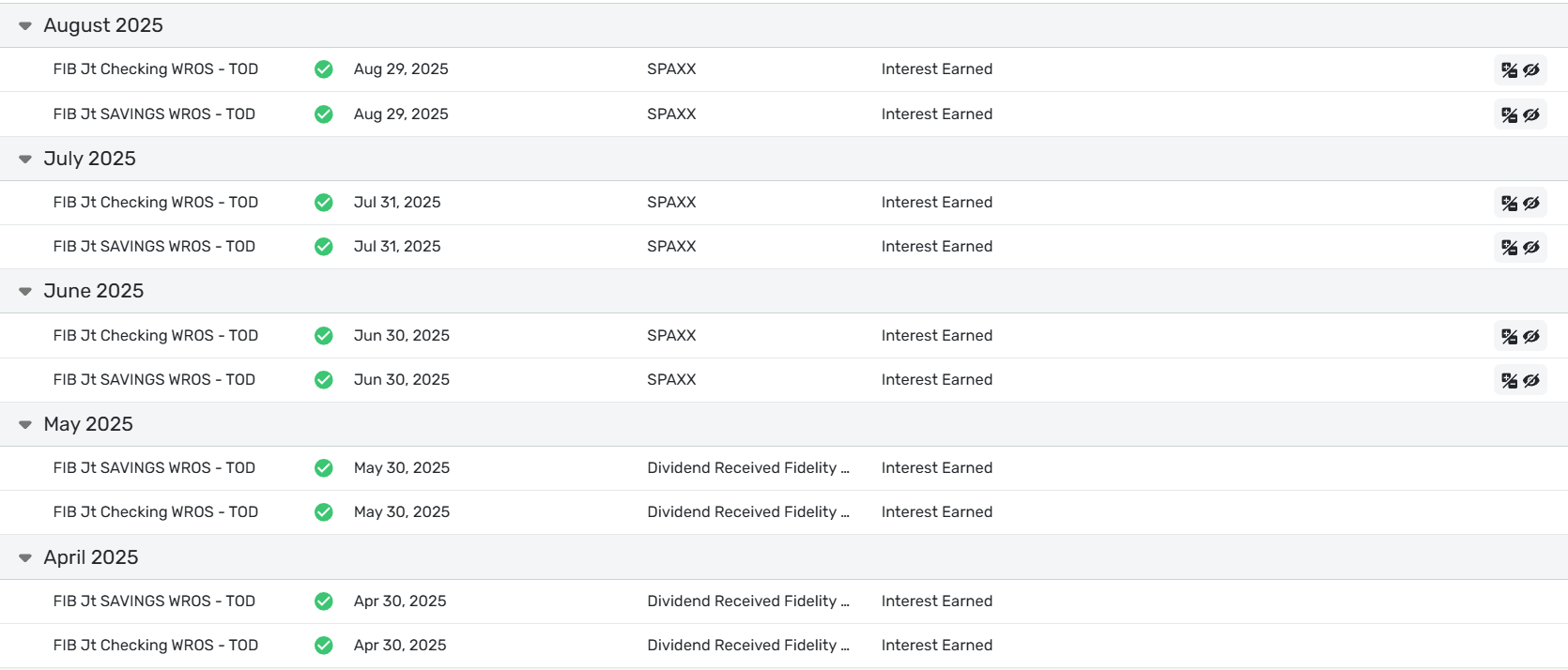 Now, my example is on the Savings Account (brokerage) but I have the same issue on the Checking account as well, which is a Checking account both in Simplifi and Fidelity. The "core account" in each is the same, SPAXX. Before June these transactions came across as "Dividend Received" but starting in June they now come across as "SPAXX" even though the detail transactions still show "Dividend Received"
