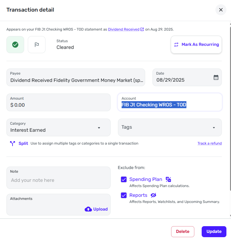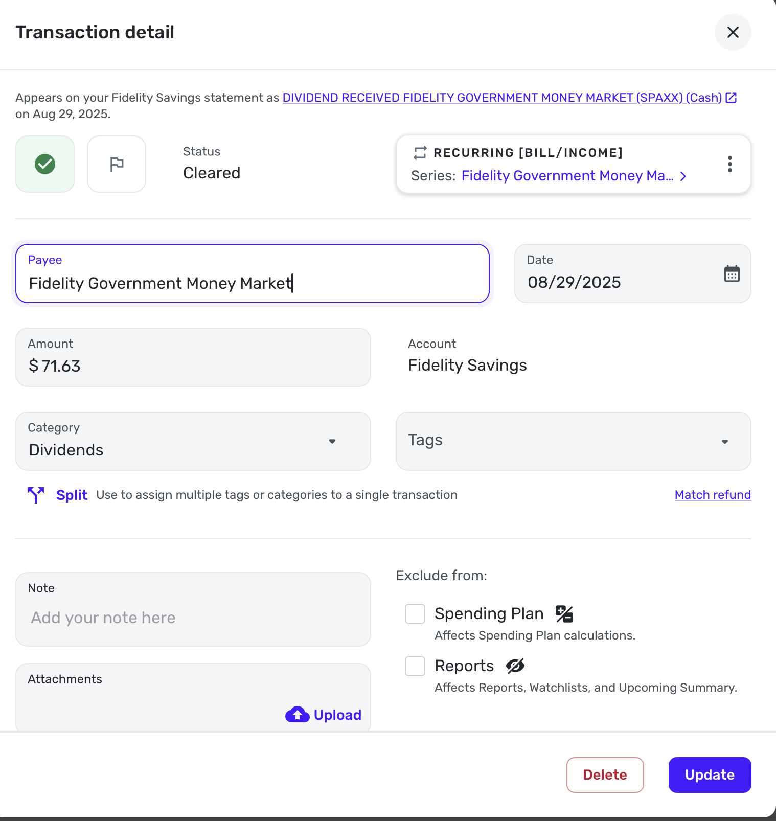 Historically when Fidelity posts "Dividend Received" I have categorized this as "Interest Earned." This still works. Although starting in June 2025 each transaction is automatically excluded from Simplifi's Reports and where I can uncheck the exclusion, Simplifi marks it as excluded again.