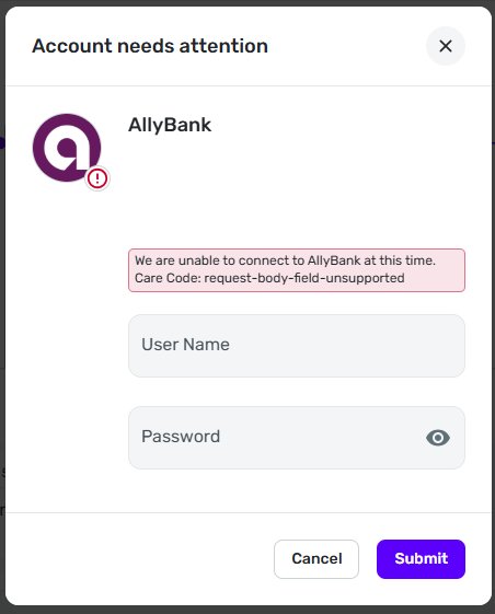 Simplify - Ally Bank no longer connecting (request-body-field-unsupported)