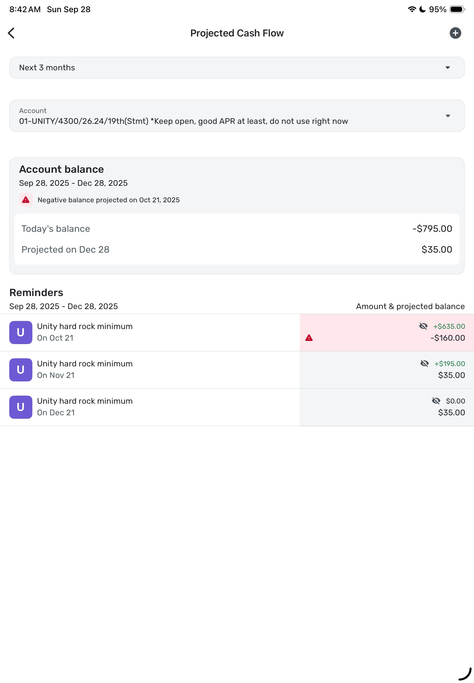 The positive/negative signs for forecasted balance of credit cards is inconsistent between the mobile app and the web app. This should be corrected, though I realize if web is set tto match mobile it will significantly change how the charts look (they may go down instead of up).