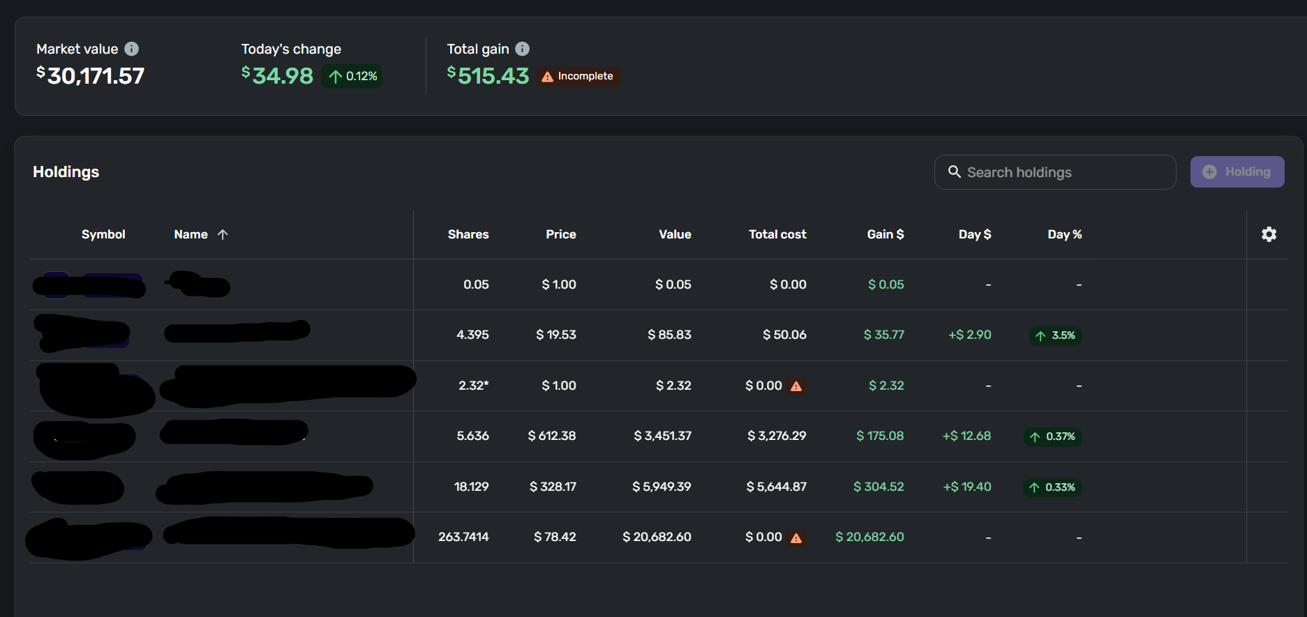 To enter this data in QS click on the three-dot menu at the right side of each individual position and select "Edit holding." The edit widow will pop up and you can enter the amount of your "total cost" in the appropriate data field.