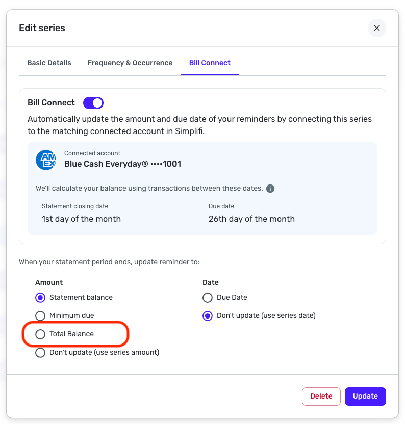 I believe that the statement balance is provided via aggregation with the bank, so they are the ones providing the amount at that juncture. The amount of the reminder will update based on how you have Bill Connect set up for the card, and there is a three-day buffer before this takes place.
