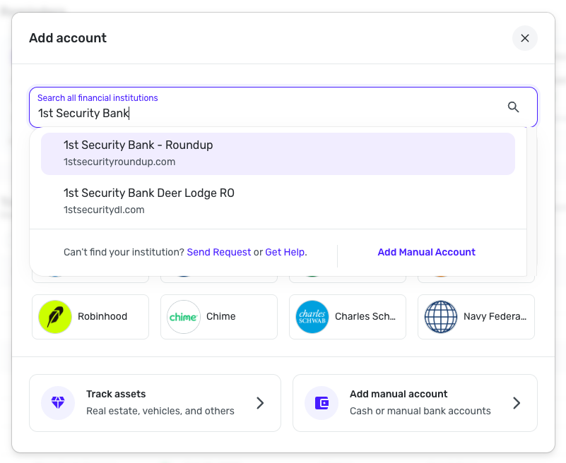 - Once you see the account(s) listed in the Manual Accounts section under Settings > Accounts, go back through the Add Account flow to reconnect to the bank.