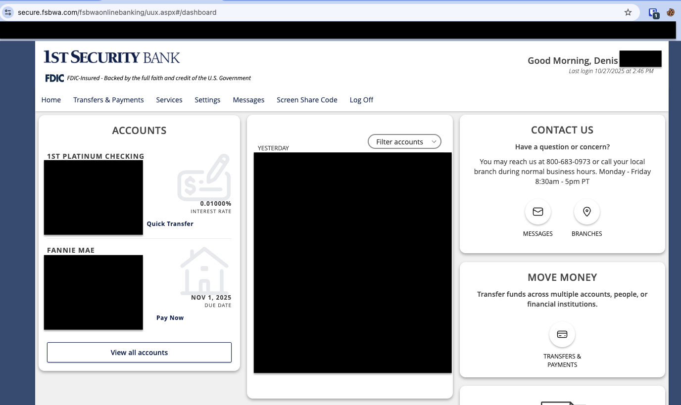 Issues with 1st Security Bank of WA (FDP-103 / FDP-2102)