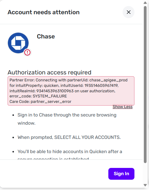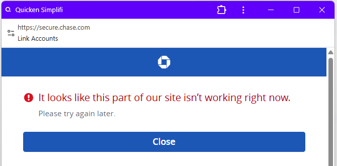 But when I click the Re-Authenticate button and put in my credentials Chase bank fails to complete the work flow: