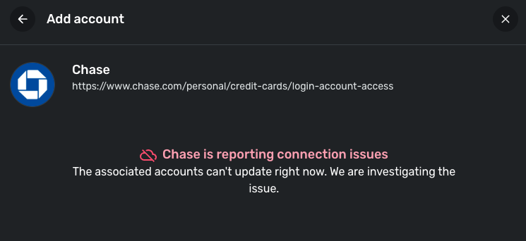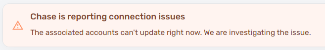 Thanks for letting us know. It looks like Chase is indeed reporting connection issues at this time. We are looking into the issue, so in the meantime, I would keep trying to connect every once in a while and be on the lookout for when that banner disappears.