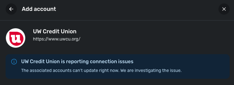 Thank you for reaching out! From our side, I can see the FDP-102 error you are receiving when trying to connect with UW Credit Union. These types of errors usually clear up after waiting 48 hours, but I can see that UW Credit Union is reporting connection issues at this time.