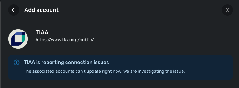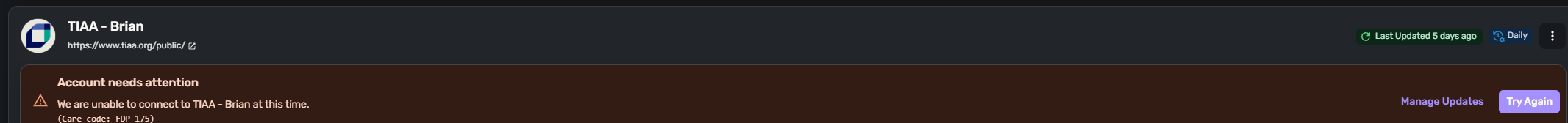 TIAA has been having intermittent connections for us with Simplifi. It has now not connected for the past 5 days. with the error FDP-175. Unlike previously, it does not indicate that anyone is investigating it. Is there effort to make the TIAA connection more reliable? It is pretty important to our financial management and by extension the utility of simplifi for us.