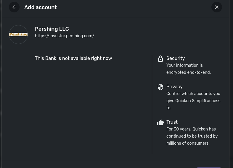 I spoke to pershing they will contact quicken tomorrow to resolve this quicken simplifi shortcoming. Apparently this is not an issue with quicken classic, have you checked to see if this option is available on quicken ckassic if so why not migrate to simplifi. Your customers will appreciate it. What is the quicken service request ticket number for this bank addition request?