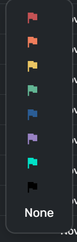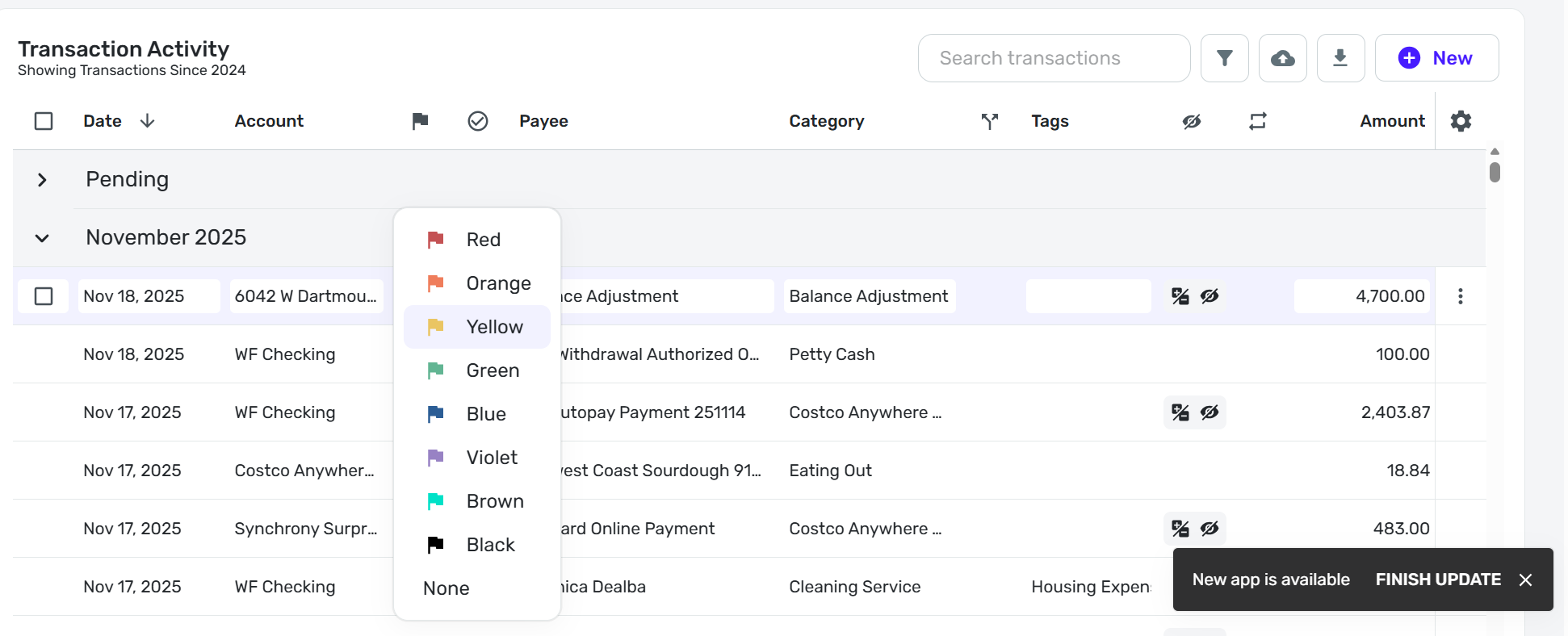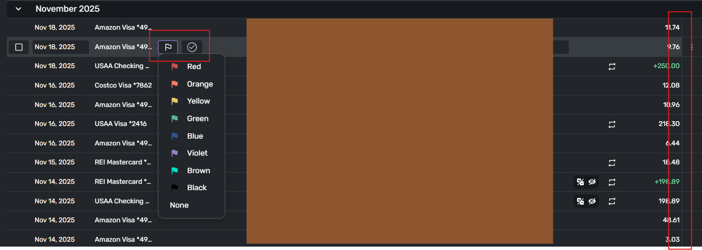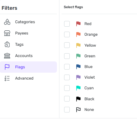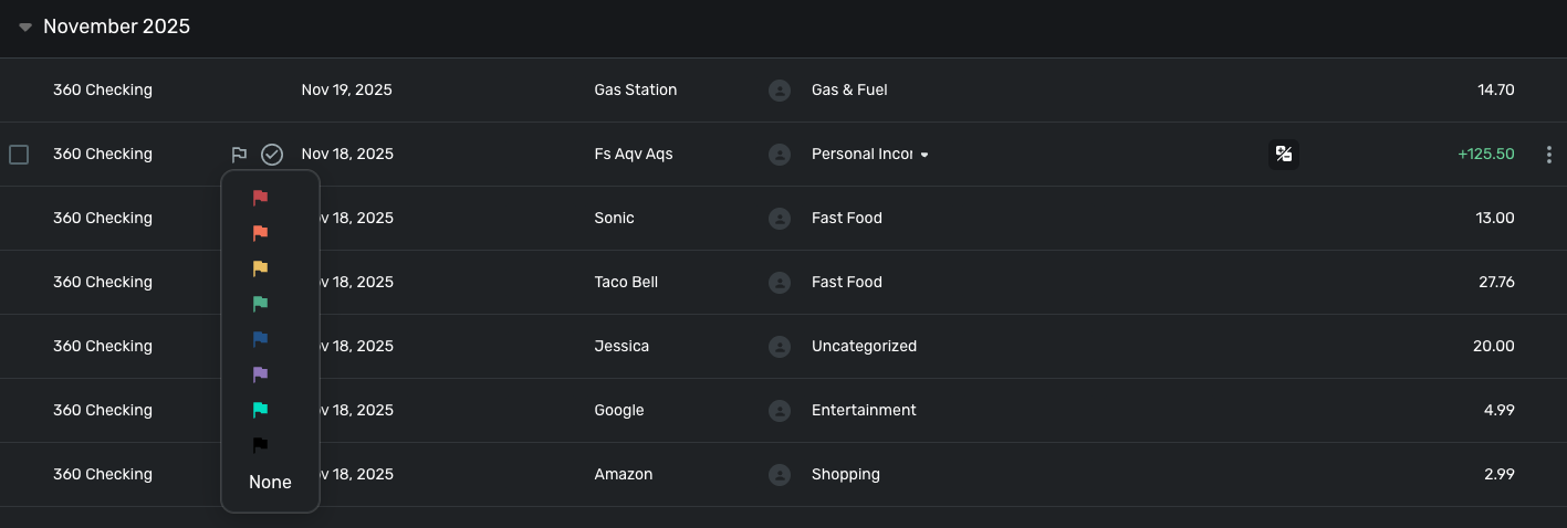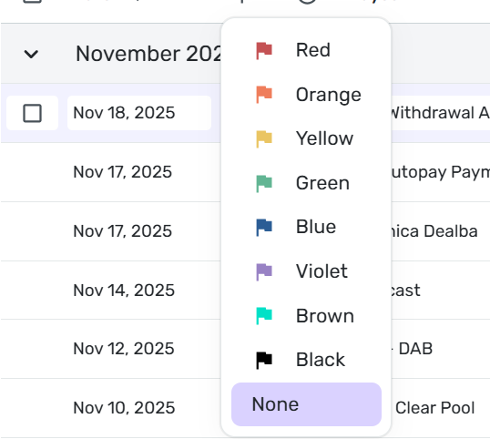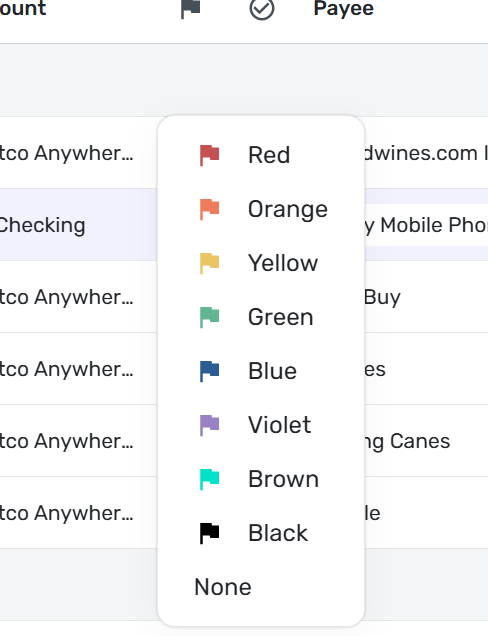 Make sure the "Flag" column is selected in the Settings Menu (Gear icon). Move your cursor to any transaction in the transaction list and click on the "Flag" icon that appears in the "Flag" column. When you click on the flag a list of colored flags will appear.