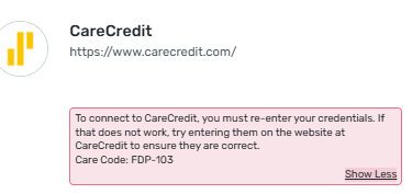 I am trying to add a new Care Credit account and keep getting an FDP-103 error. Following advice from other posts, I tried connecting several times through carecredit.com, as well as through others with the synchrony.com domain. Worth noting that when I try to check my credentials through carecredit.com, the login page goes to https://id.synchrony.com/idp/en. I am sure my credentials are correct, but not sure how else to go about connecting in Simplifi.