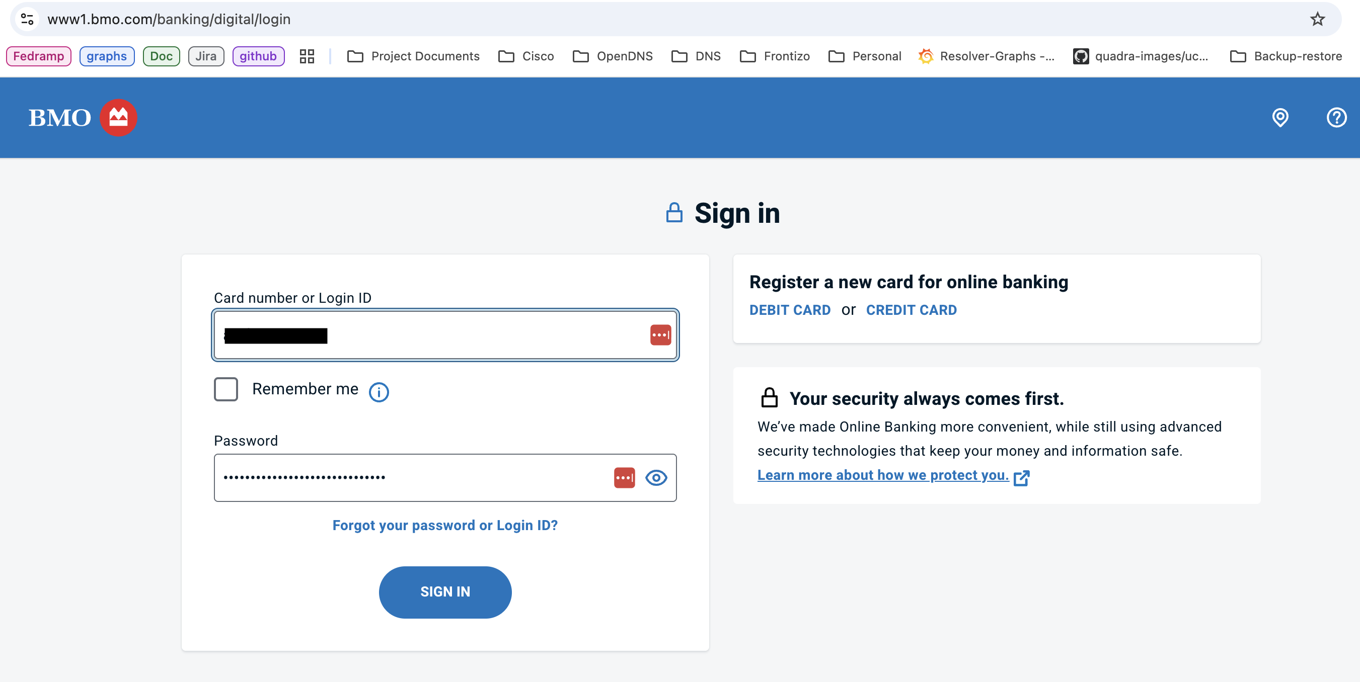 - A Visa card which I have recently obtained, that uses a login name plus a password to sign in at bmo.com under the same login/password dialogue as is used with the Mastercard.
