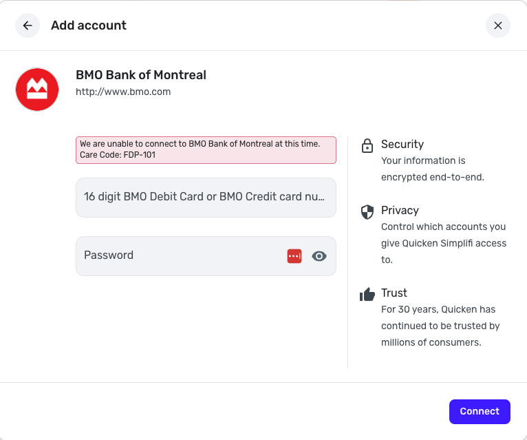 Thanks for reaching out! I can also see the FDP-101 error you are receiving when trying to connect to BMO Bank of Montreal. I do know we have other instances available for this bank in Quicken Simplifi. Have you tried any of the others to see if they work for you?