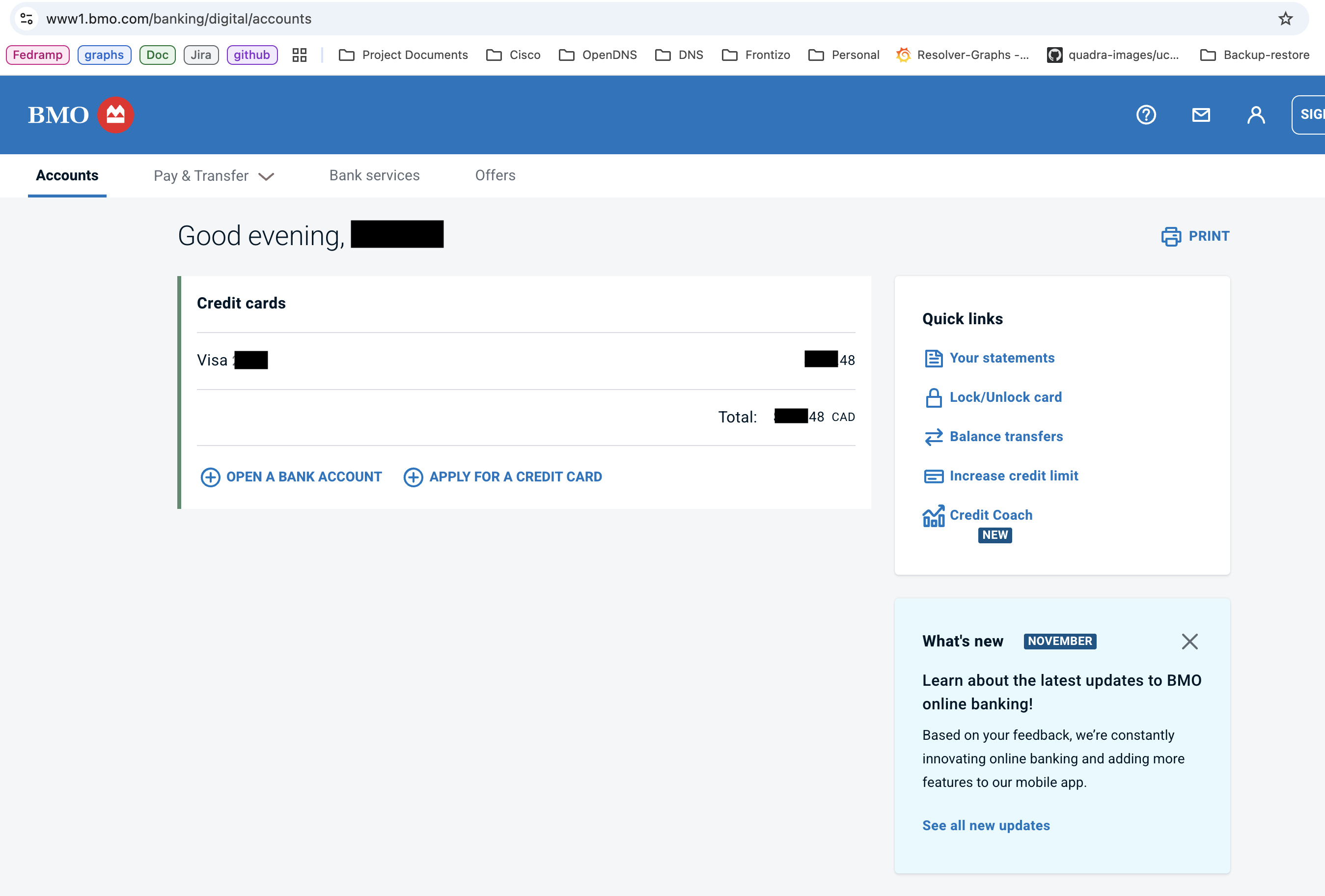 Note also, BMO will not amalgamate both cards into a single login with two accounts unless you pay them monthly to have a BMO current account.