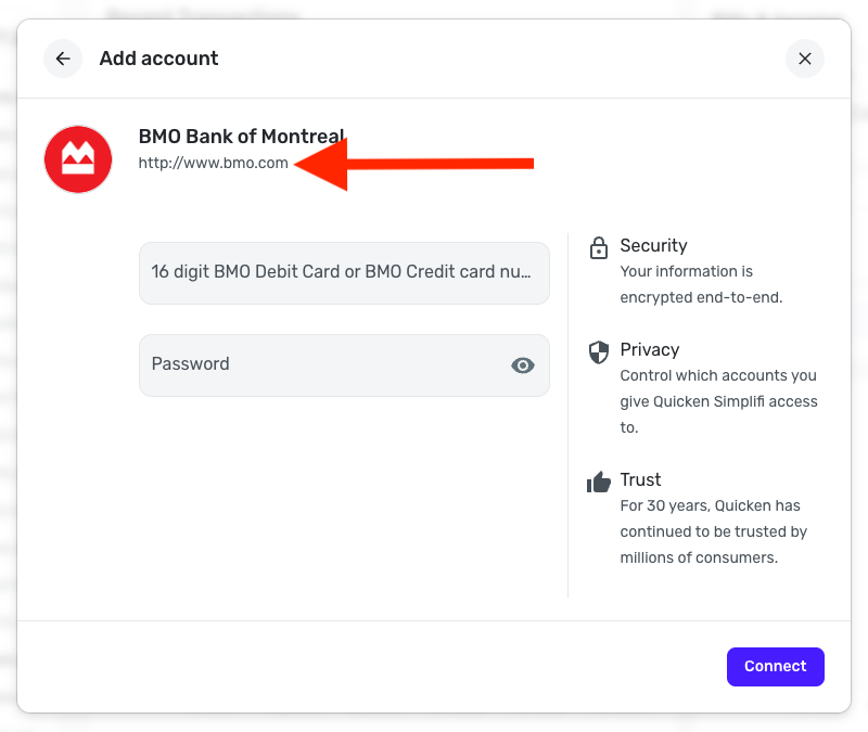 - A Mastercard that uses the card number plus a password to sign in at bmo.com (under "sign in to online banking") which I've used for years with classic quicken and have used successfully since July with simplifi (after I migrated from classic).