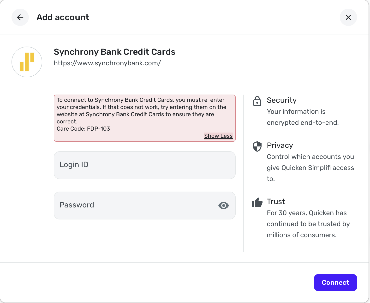 I have a couple of Synchrony store cards but don't bother connecting them to QS since we don't use them often enough to make it worth the effort. I also have savings accounts with Synchrony and if the credit card side is anything like the savings account side, at best Synchrony is unstable and has had a history of not playing well with online 3rd party connections. This is not unique to QS, I have problems with other apps that I connect to my FIs and Synchrony is always a problem child.