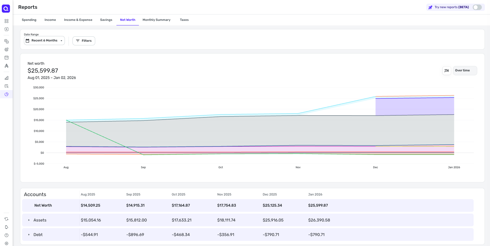 I have moved this out of Feature Requests so we can do some educating, as a Net Worth Report already exists in Quicken Simplifi. With the Net Worth Report, you can view your net worth over time, as well as filter to specific date ranges, accounts, etc.