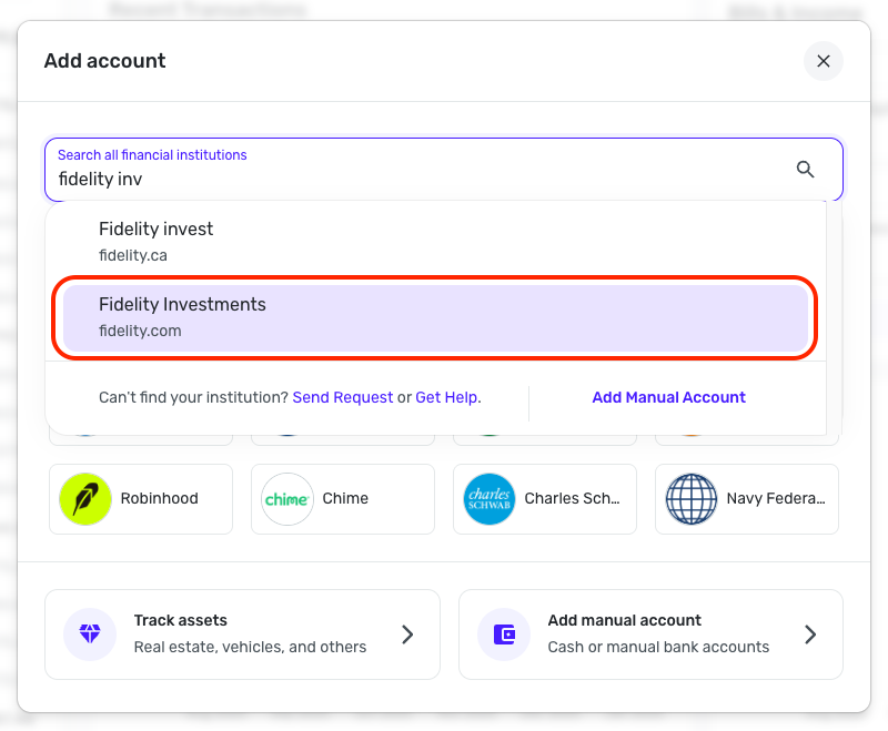 - Once you see the account(s) listed in the Manual Accounts section under Settings > Accounts, go back through the Add Account flow to reconnect to the bank using the Finicity option.