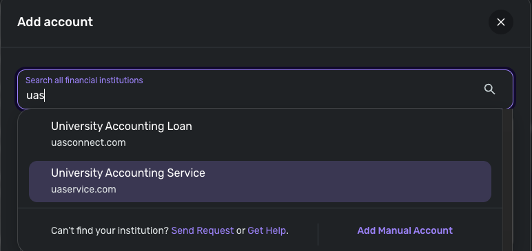 Thank you for the screenshot! After further research, I discovered that there is another instance of UAS Connect within Quicken Simplifi. I know you are using the 'University Accounting Loan' instance right now, but could you try the 'University Accounting Service' instance to see if that successfully brings the balance?
