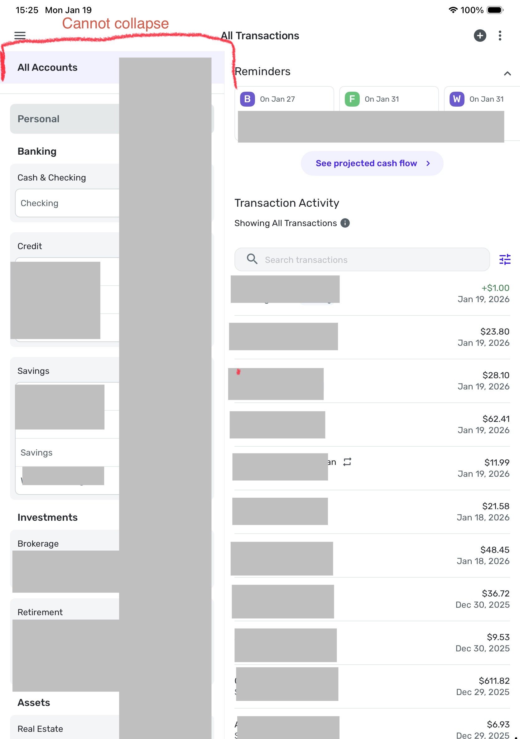 iPad App: Ability to Collapse the Accounts List in the Transactions View (edited)