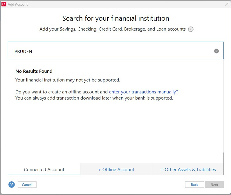 I am failing in my attempt to add Prudential as an account in Quicken Classic, for automatic downloads/updates. When I try to connect my account, and it asks for the name of the Financial Institution, Prudential is not on the list! What should I do?