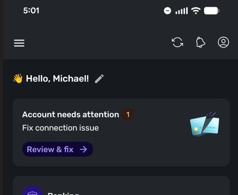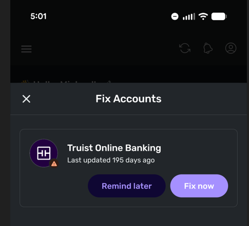 Very recently, on Android, after opening Simplifi app, I get an Accounts need attention notice. This appears to be for old Truist account that was made manual in order to add new one, since there was a change in the way Simplifi handled Truist connections mid last year, per the support post below.