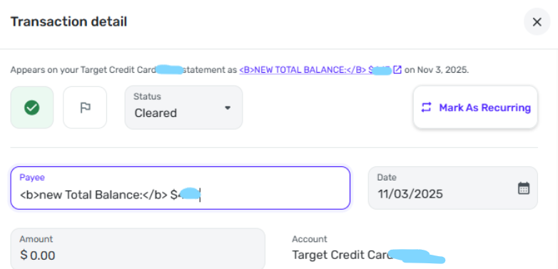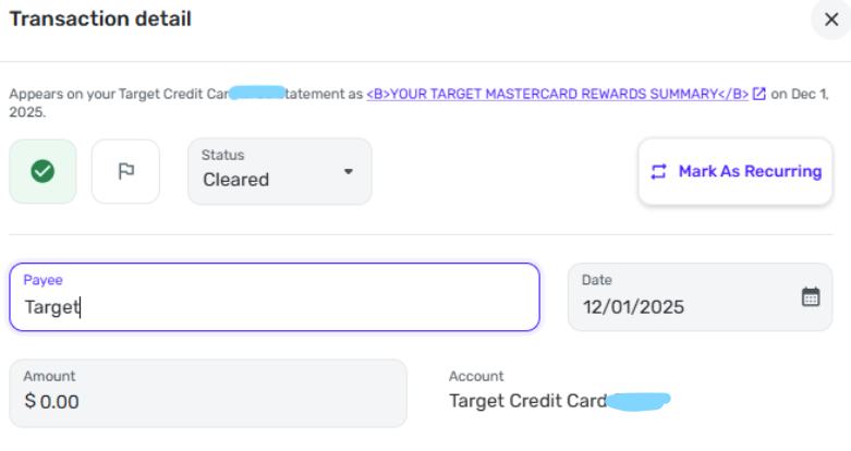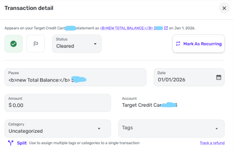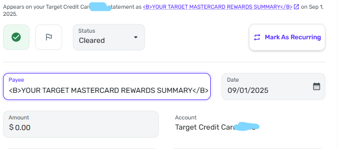 Thanks for the screenshots! It definitely seems like this may be information being sent from Target's side that is interpreted as a transaction of some sort. If you check on the financial institution's website, does this monthly transaction show there in any form?