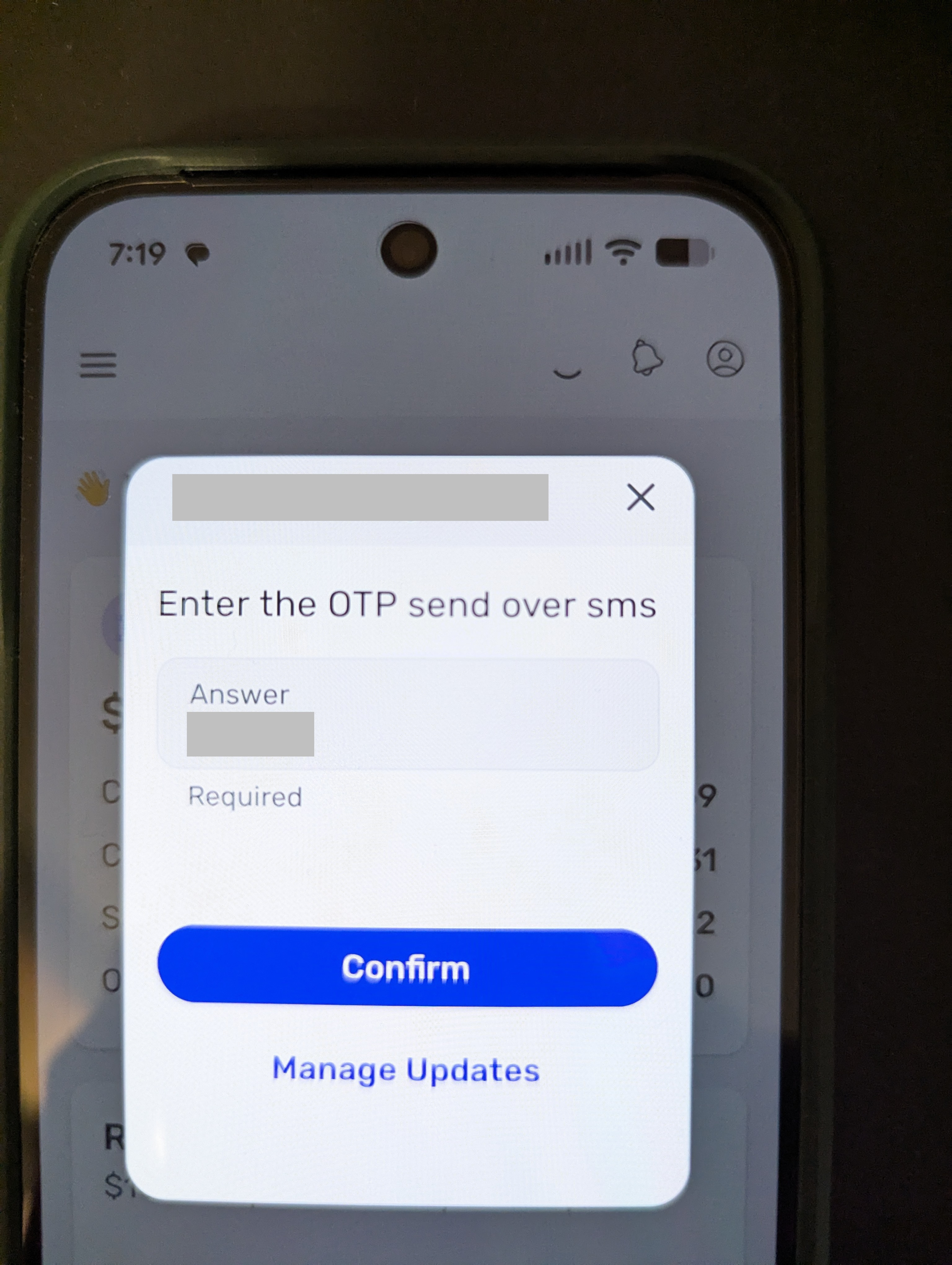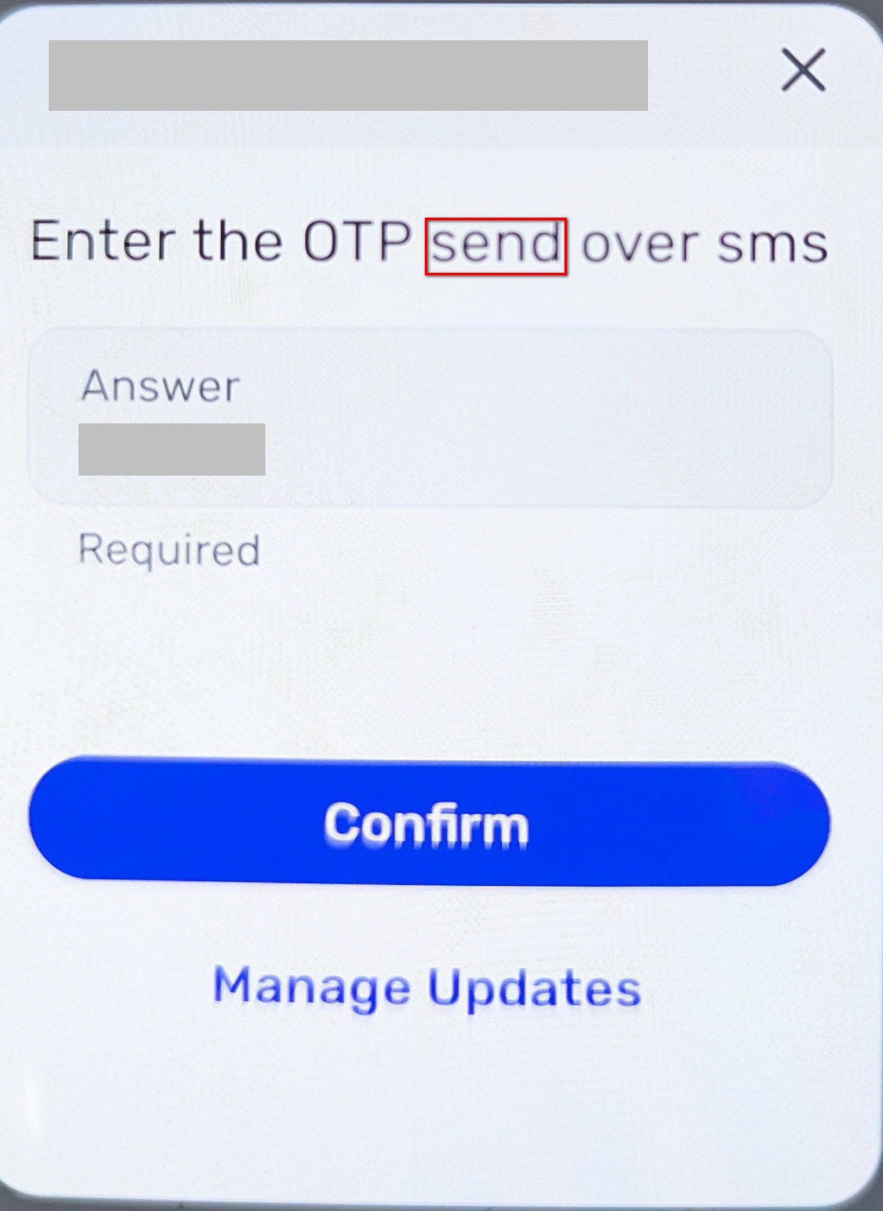 Attached is a photo of the OTP popup with more context than the original photo I sent. I hope it helps.