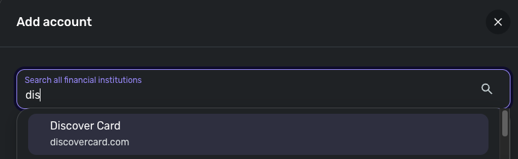2. Once you see both the original and the new account listed in the Manual Accounts section under Settings > Accounts, go back through the Add Account flow to reconnect to the 'Discover Card' bank option.