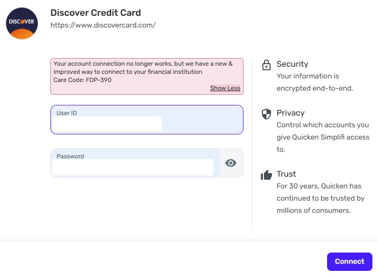 However, you shouldn't have two separate accounts. When reconnecting the account to the 'Discover Card' option, you would want to link the connection to the original account in Quicken Simplifi, not add a new account. Could this be the reason you have a gap in transactions?
