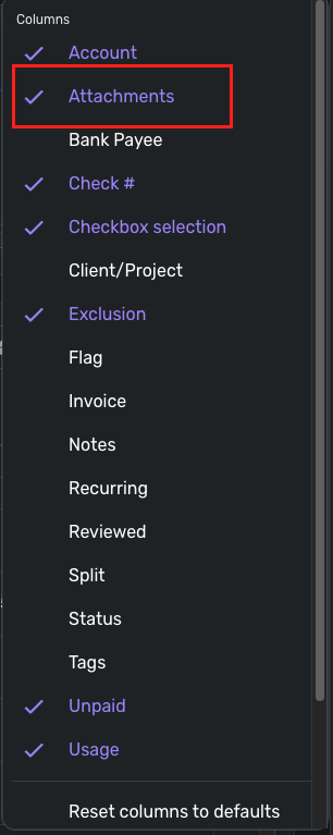 Please verify that your "Attachments" column is checked by selecting the gear icon in the top-right corner of your register.