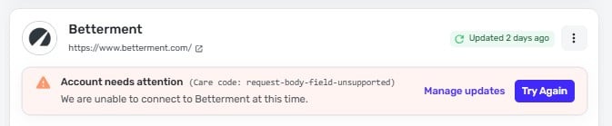 Betterment Not Connecting to Simplifi (Care code: request-body-field-unsupported)